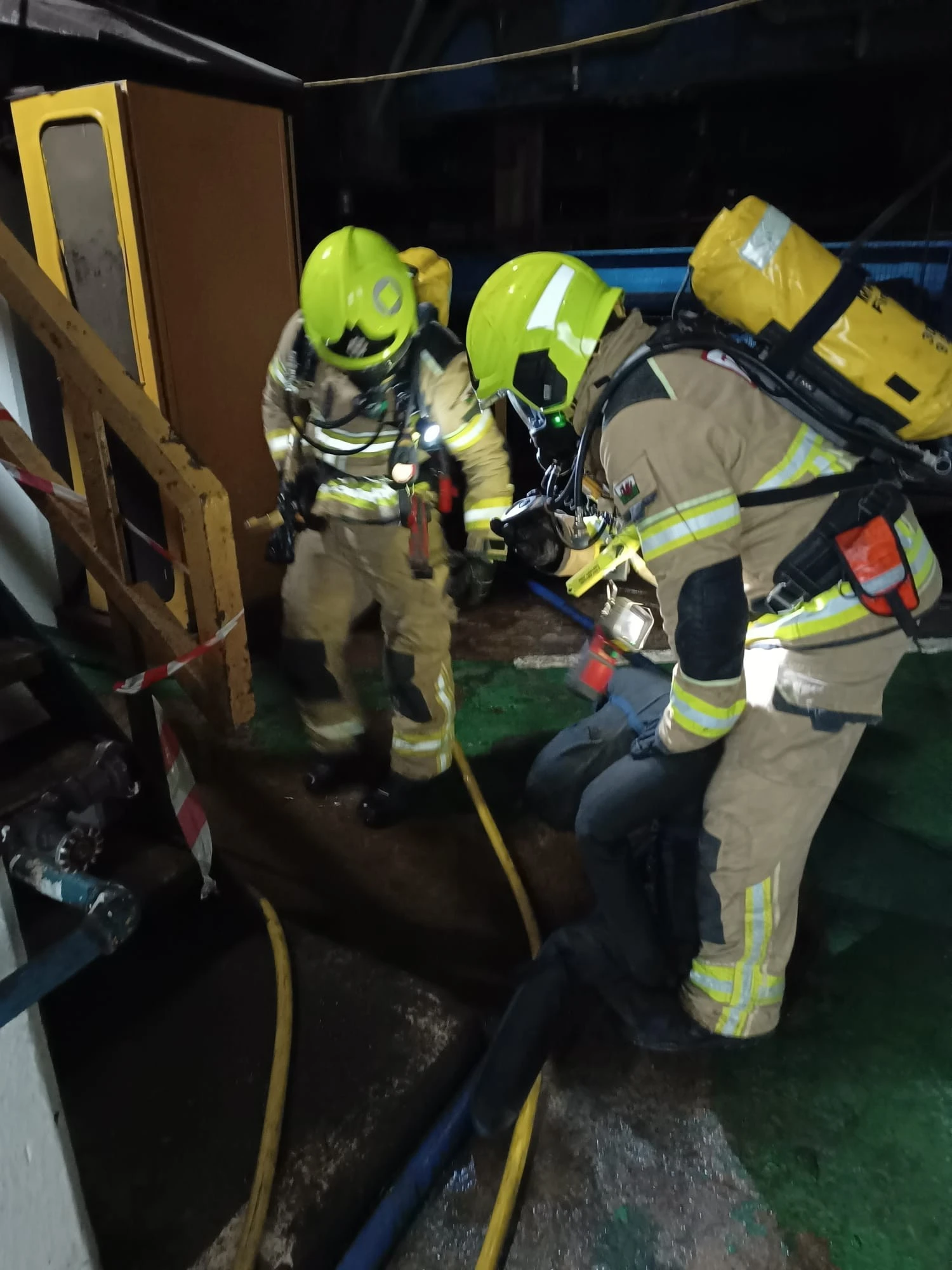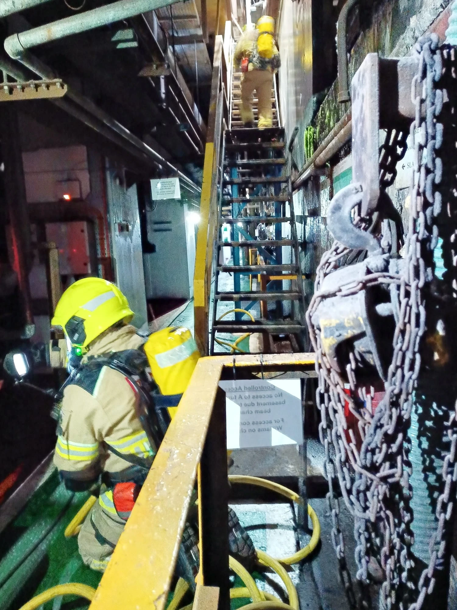 TATA Steel proved to be an ideal location for the exercise, allowing crews to familiarise themselves with the layout, and gain a clearer understanding of the hazards present. Six crew members wearing Breathing Apparatus (BA) successfully entered the basement area and rescued three missing casualties.
