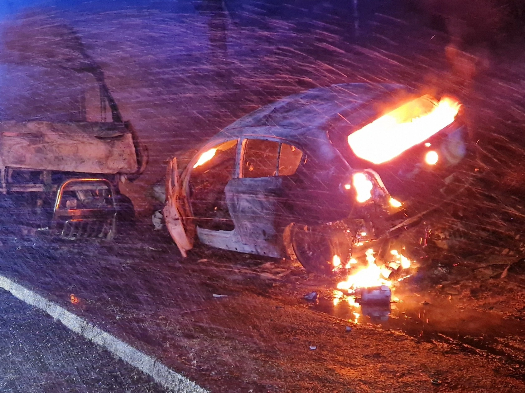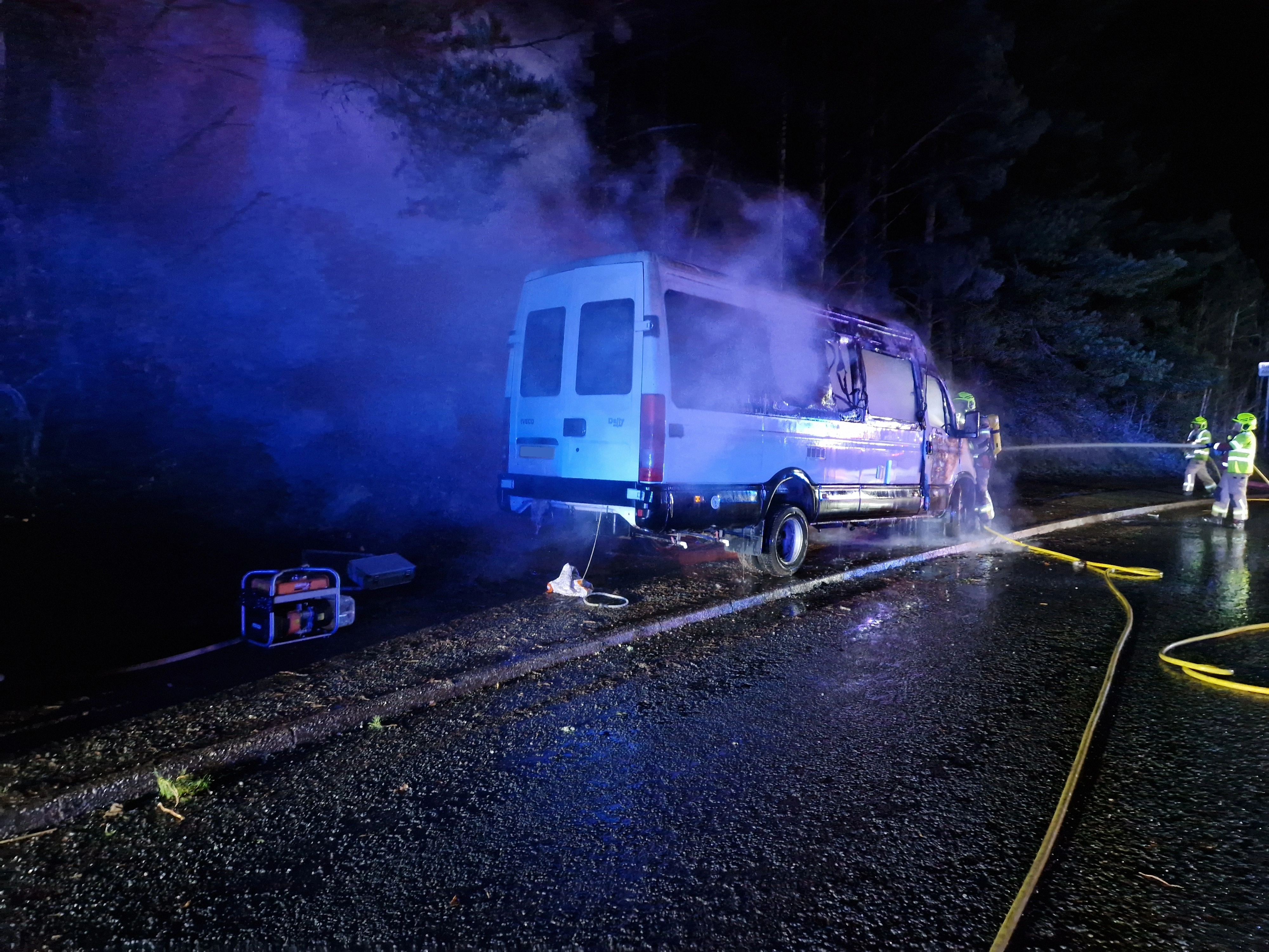 Crews responded a road traffic collision involving one private motor vehicle and one campervan. The private motor vehicle had collided with the stationary campervan which caused a fire. Crews utilised two breathing apparatus sets, five hose reel jets, small tools and lighting to extinguish the fire. No casualties were trapped nor injured in either vehicle. Both vehicles were destroyed by the fire.