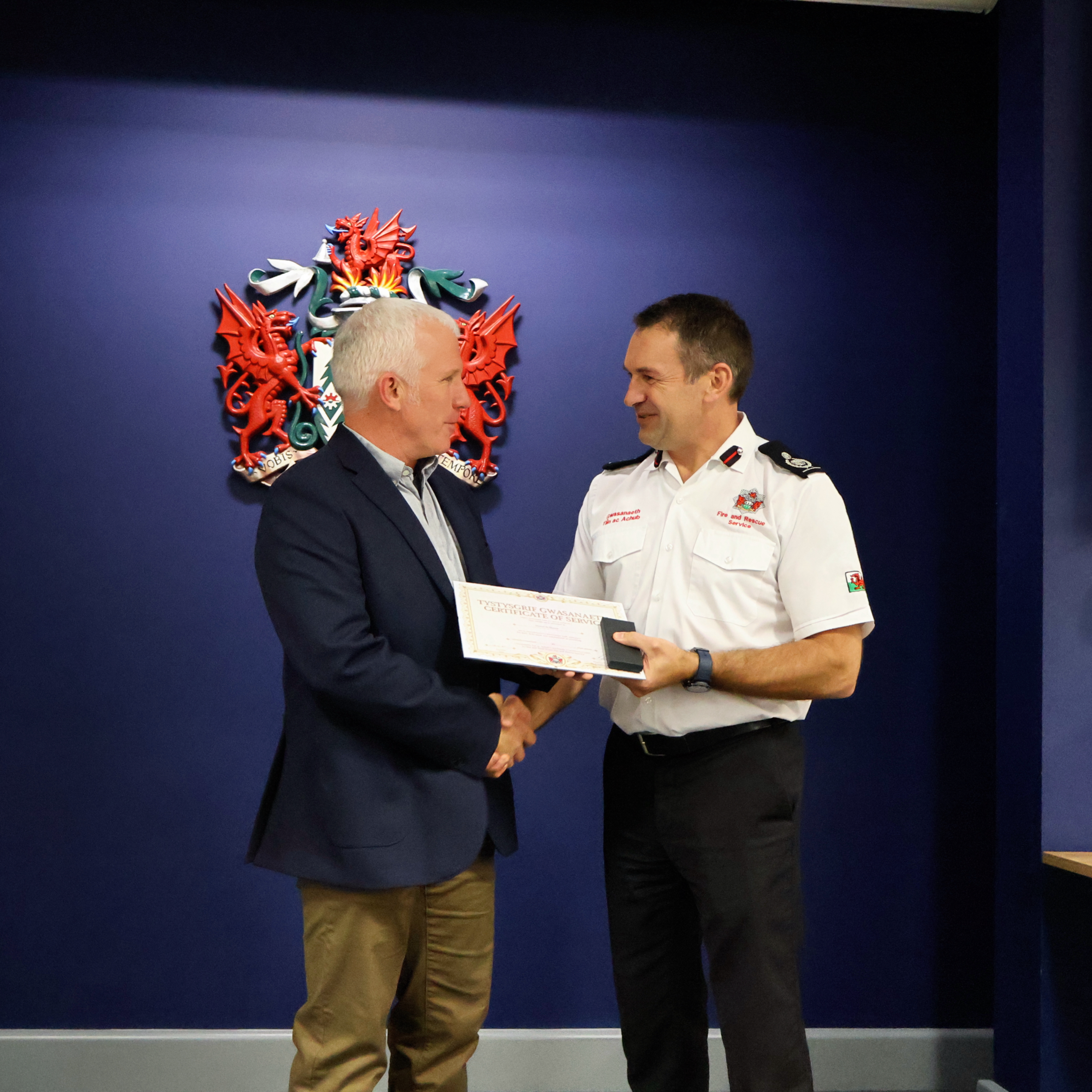 The first to be presented with their award was David Jenkins from the Community Safety Team, followed by Christopher Davies, former Chief Fire Officer, Watch Manager David Williams from Operational Risk Management; Watch Manager Alan Tomas, Crew Manager Delyth Davies, and Firefighter Rhain Jenkins, all from Joint Fire Control; Watch Manager Jason Oliver from Llanelli Fire Station; Crew Manager Stephen Rickard from Haverfordwest Fire Station; Crew Manager Robin Mayne from Milford Haven Fire Station; Watch Manager Jeremy Lees from Tenby Fire Station; Watch Manager Aelwyn Evans from Joint Fire Control; Firefighter Colin Jenkins from Llandeilo Fire Station; and finally Bernard Armstrong from Milford Haven Fire Station.