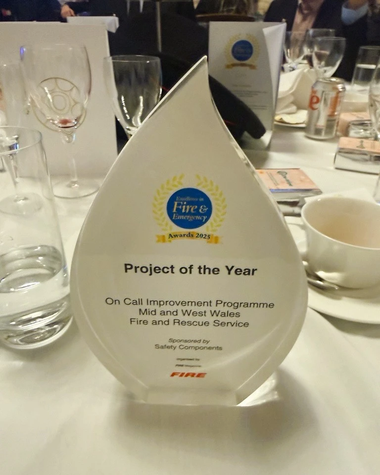 Mae Rhaglen Gwella Diffoddwyr Tân Ar Alwad Gwasanaeth Tân ac Achub Canolbarth a Gorllewin Cymru wedi ennill Gwobr Prosiect y Flwyddyn yng Ngwobrau Rhagoriaeth yn y Gwasanaethau Tân ac Argyfwng 2025.