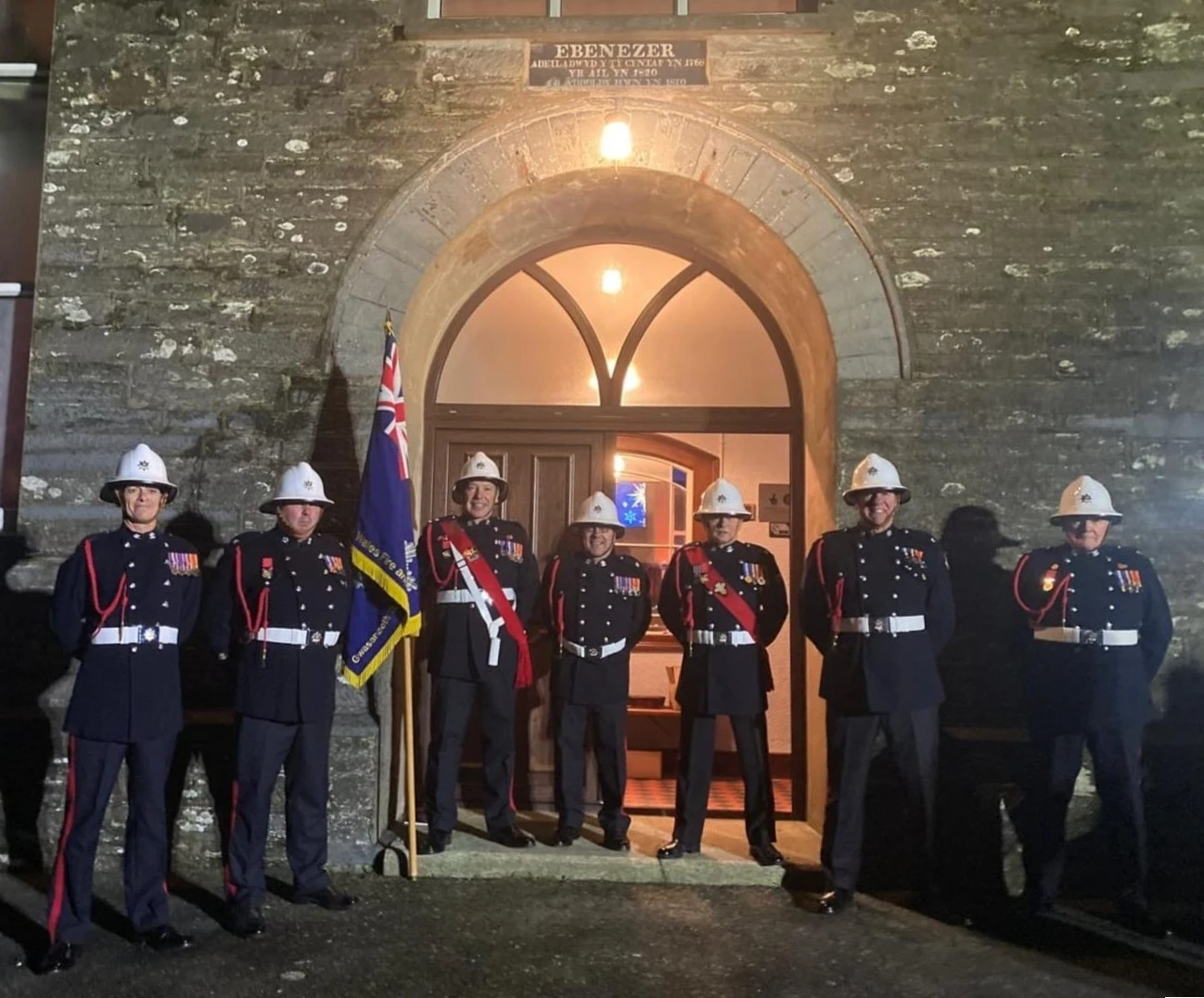 As displayed in the picture above and below, the Colour Party wear ceremonial uniform (tunics, white helmets and axes) and proudly carry both the Nation standard and the Mid and West Wales Fire and Rescue Service standard, they are instantly recognisable as an integral part of our fire service family.