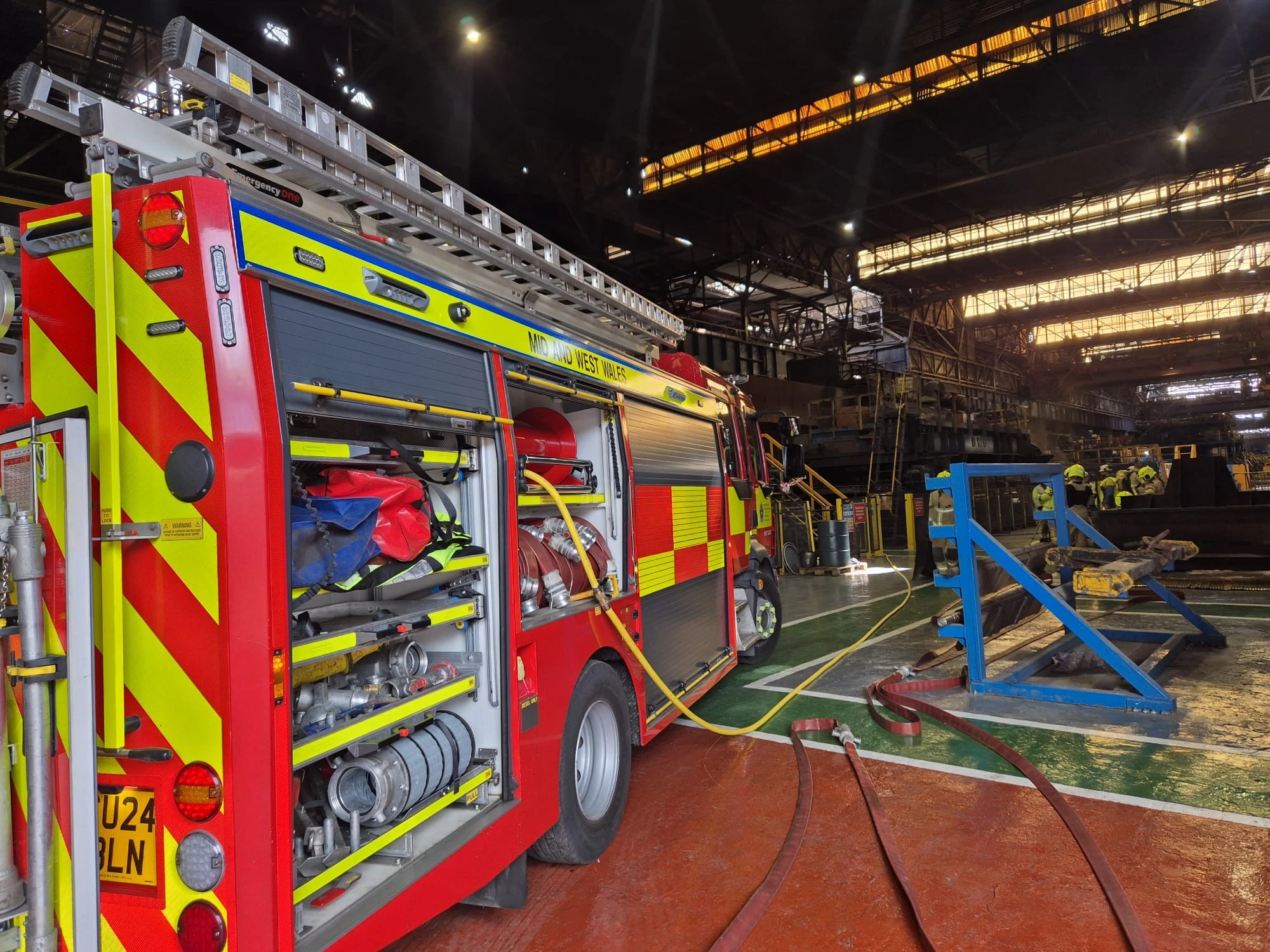 On Saturday, 28th March, Mid and West Wales Fire and Rescue Service (MAWWFRS) crew members took part in a 4-pump training exercise named ‘Exercise Frostline’, held at the TATA Steel in Port Talbot.