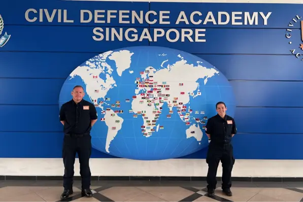 Station Manager Rebecca Davies and Watch Manager Stephen Fuge attended the course at the Singapore Civil Defence Force facility from October 9th to 12th. The training programme covered all core aspects of ISAR operations, including command and control, shoring and breaching, working at height, line access, and casualty extrication and care.
