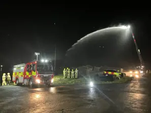 During the exercise, the crew achieved their operational target of delivering 2,500 litres of water at 10 bar pressure, projecting a powerful jet 40 metres on to the vessel. Thermal imaging cameras were used simultaneously, allowing crews on the ground to identify heat spots and direct the monitor jet with precision.